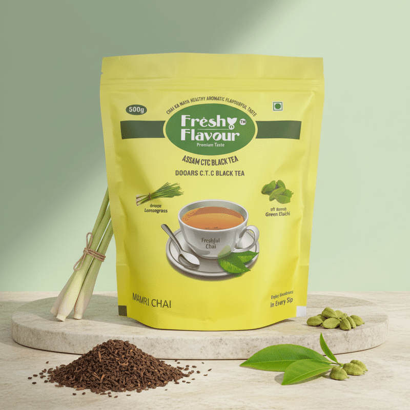 Freshful Chai Mamri Dana is the everyday hero of the Fresh n Flavour collection — a revitalising blend that brings together the bold characteristics of Assam CTC Black Tea and Dooars CTC Black Tea, enriched with the natural goodness of Lemongrass and Green Cardamom. If you love a consistently strong, brisk cup that also refreshes your senses, this freshful chai mamri dana blend is crafted specifically for your daily ritual.
